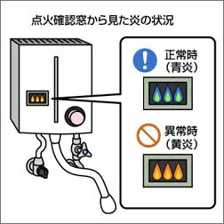 使用中は火が消えたり、イヤな臭いがしたり炎の色が黄色になっている場合は異常で不完全燃焼になるおそれがあります。直ちに使用を中止してガス機器販売店、またはメーカーのお客様相談窓口にご相談ください。 (給排気部の埃・クモの巣などの詰り、電池消耗、部品の老朽化など)
